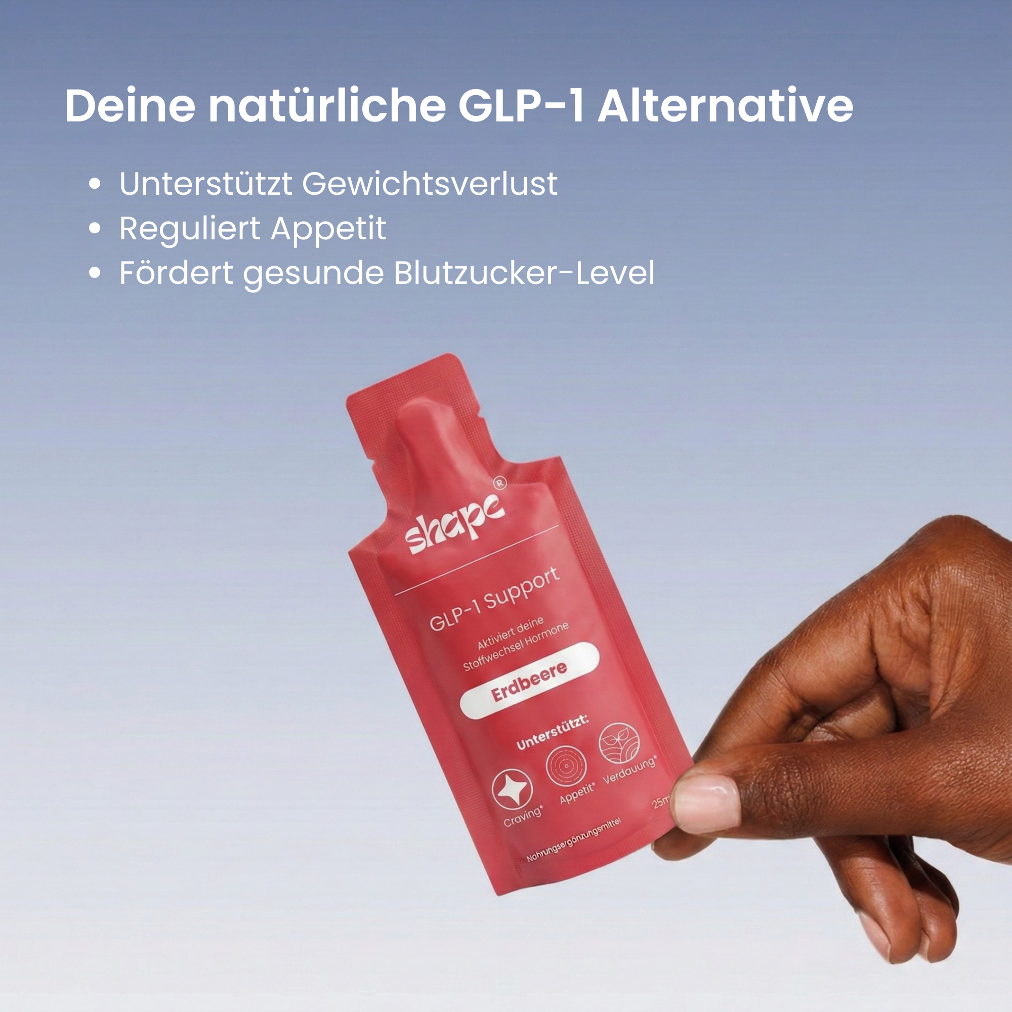 Gute Frage — und der Zweifel ist berechtigt. Shape funktioniert nicht wie ein Wundermittel. Es funktioniert weil es physikalisch sättigend wirkt (Gel quillt auf), weil es nachweislich GLP-1 stimuliert, und weil es ein Format ist das man tatsächlich täglich verwendet. 73% der Menschen, die mit Supplement-Programmen aufhören, hören wegen des Aufwands auf. Wenn der Aufwand 3 Sekunden ist, bleibt man dabei.